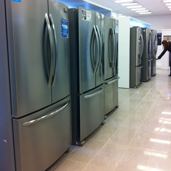 The line itself reminds me of a cafe. Slightly industrial, very professional looking, and well. Awesome. That's the GE Cafe Counter Depth fridge, and matching appliances set up in the store. Read more about the rest of the appliances that we picked after the jump....