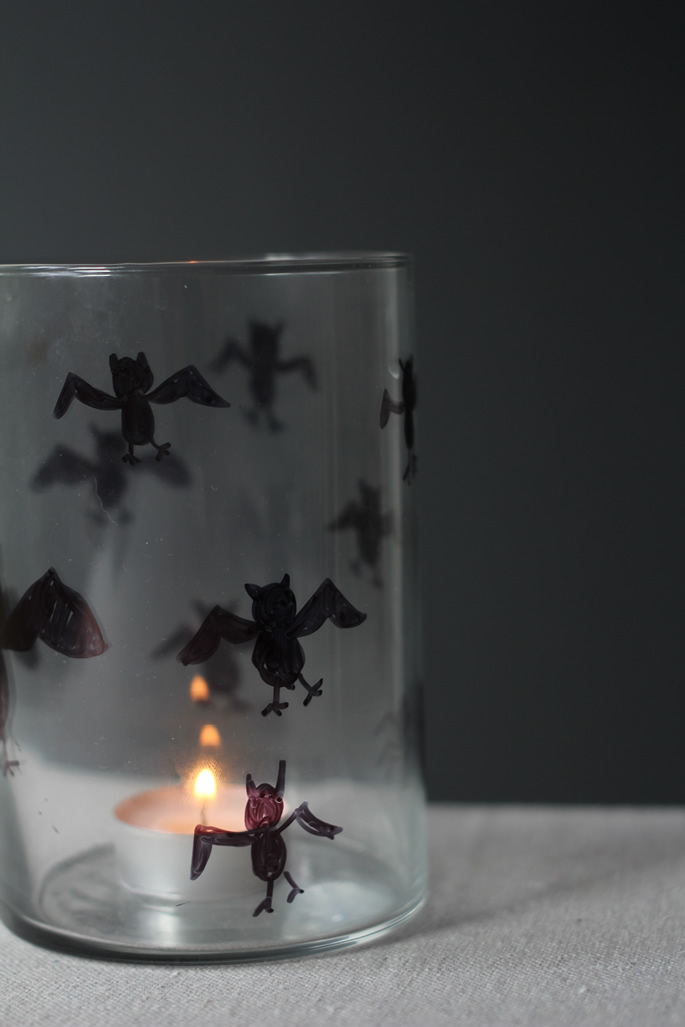 In all seriousness, I started doodling on a vase that I had picked up from the dollar store and before you knew it, Oscar and I were counting bats and working together to decide where to put them. (And a singular spider that makes an appearance) All you need is a thin black sharpie, a glass jar or vase and that's it. I Googled Bat silhouettes to remind me as to how they should look - They are by no means good looking bats but to a 3 year old they were perfect (and therefore, perfect for me too!)
